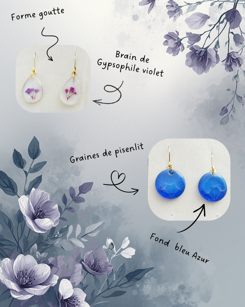 Authenticité : La nature est unique, mes bijoux le sont aussi. L'emplacement et la teinte des fleurs ou des feuilles peuvent légèrement varier d'une pièce à l'autre, ce qui garantit que vous porterez un modèle vraiment singulier.