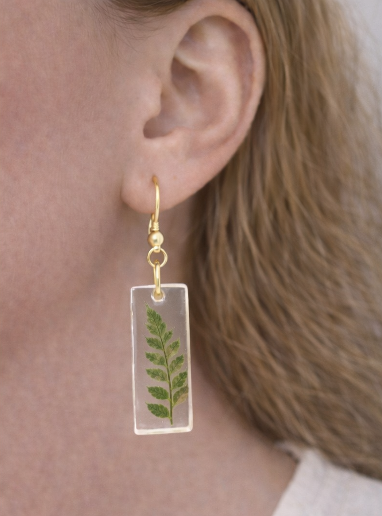 Succombez au charme de ces boucles d’oreilles artisanales uniques. Une délicate composition de fougère immortalisés dans une résine haute transparence pour sublimer leurs couleurs et détails naturels.