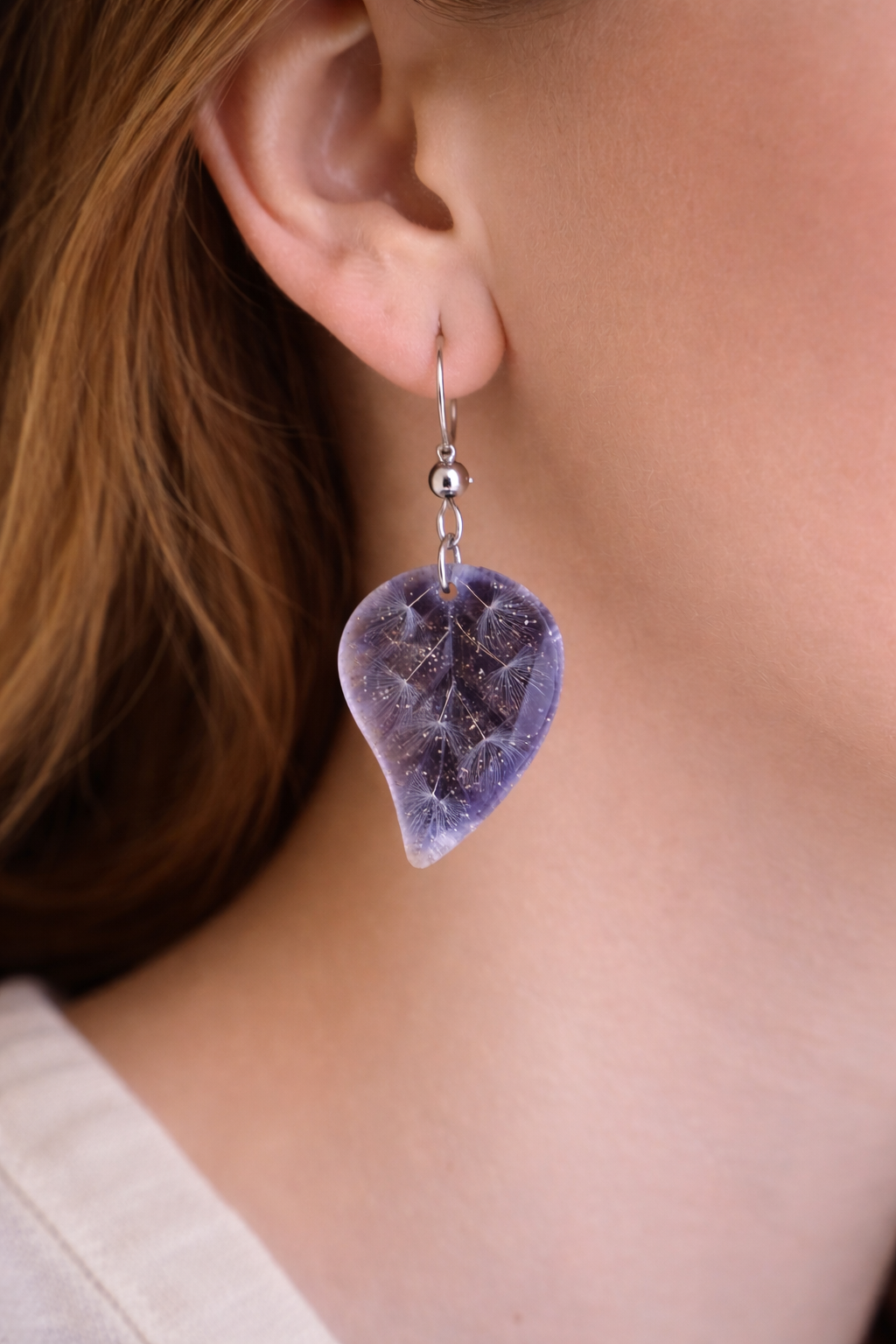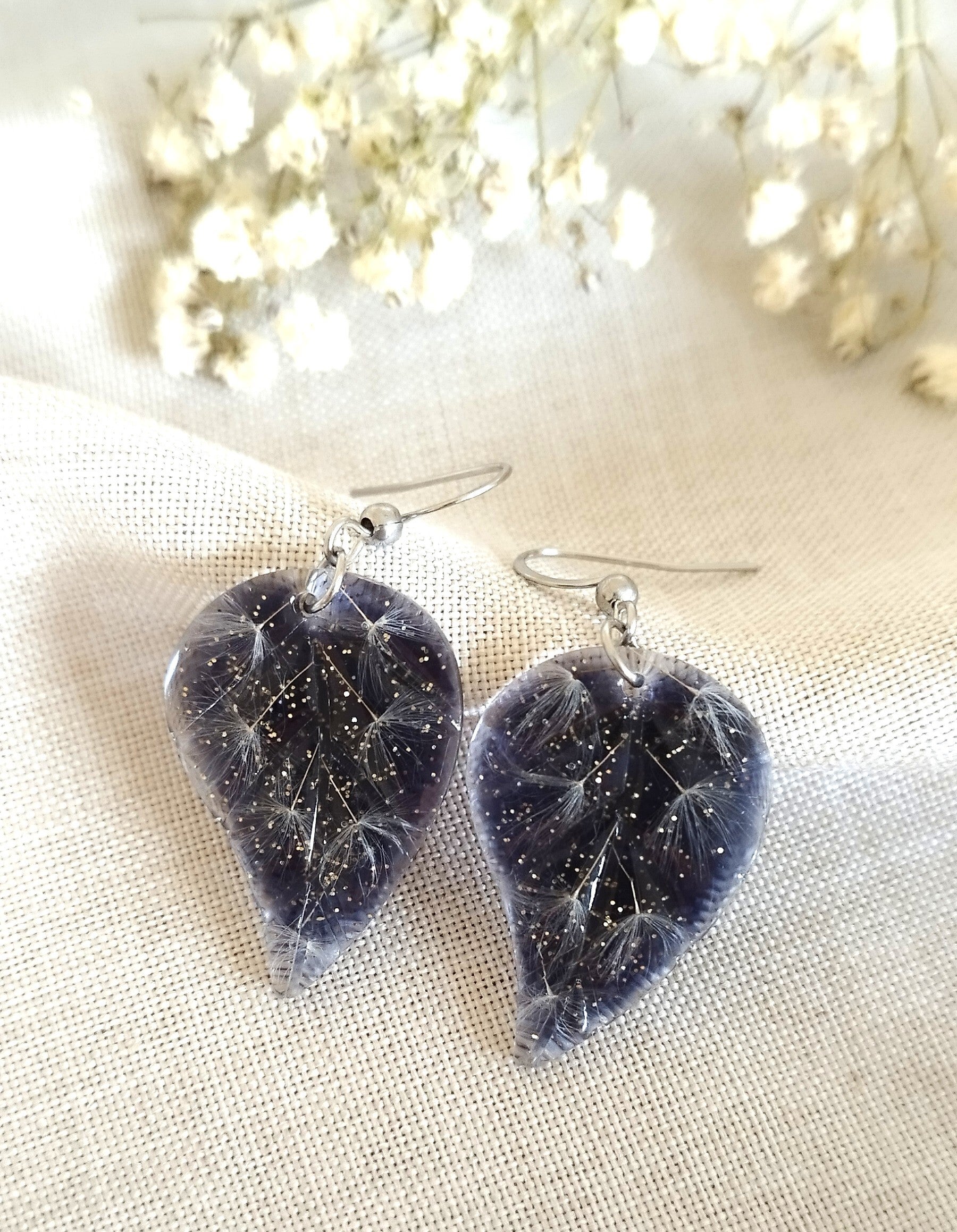 Succombez au charme de ces boucles d’oreilles artisanales uniques. Une délicate composition de graine de pissenlit=dandelion sur un fond bleu nuit pailletée, immortalisés dans une résine haute transparence pour sublimer leurs couleurs et détails naturels.