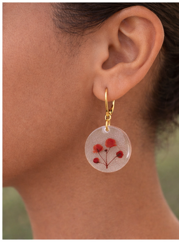 Une création délicate qui capture la légèreté du Gypsophile dans une résine cristalline. Ces boucles d'oreilles révèlent la finesse des fleurs rouges, comme un petit nuage de douceur à porter au quotidien.