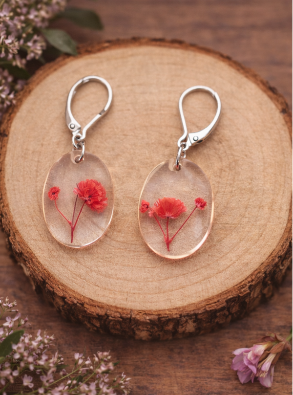 Succombez au charme de ces boucles d’oreilles artisanales uniques. Une délicate composition de gypsophile rouge immortalisés dans une résine haute transparence pour sublimer leurs couleurs et détails naturels.