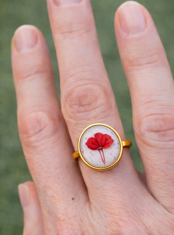 Laissez-vous charmer par la délicatesse de cette bague artisanale. Une véritable fleur de gypsophile rouge, est immortalisée dans une résine cristalline. Ce bijou capture toute la poésie d'une fleur printanière pour sublimer vos mains avec élégance.