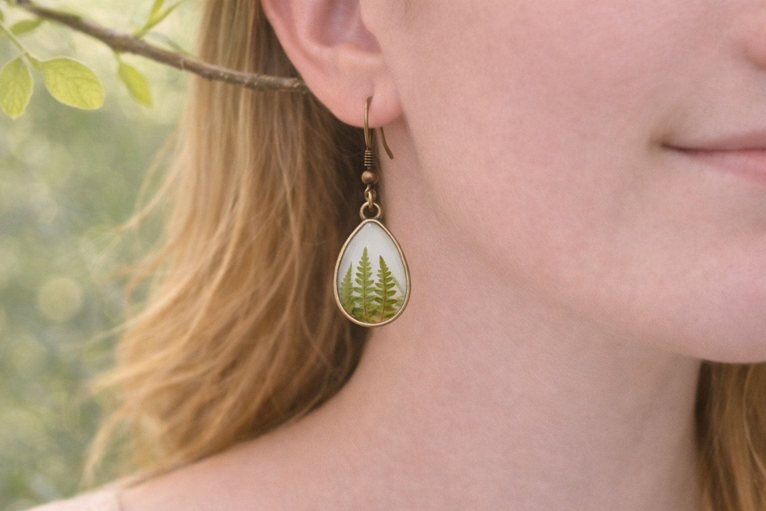 Succombez au charme de ces boucles d’oreilles artisanales uniques. Une délicate composition de fougères = "mini-forêt", immortalisés dans une résine haute transparence pour sublimer leurs couleurs et détails naturels.
